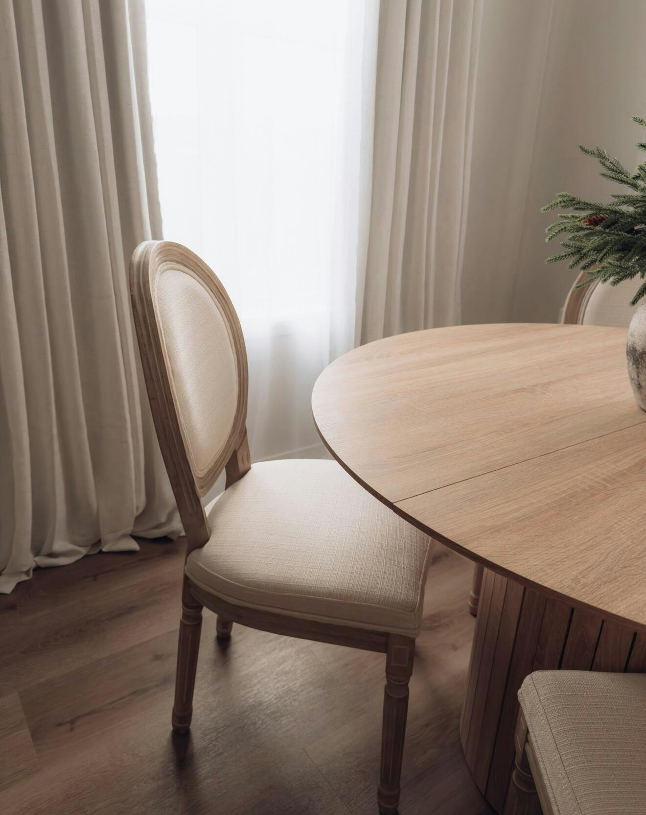 Upholstered in durable linen, the french dining chairs provide soft, breathable comfort year-round, combining timeless style with everyday practicality.