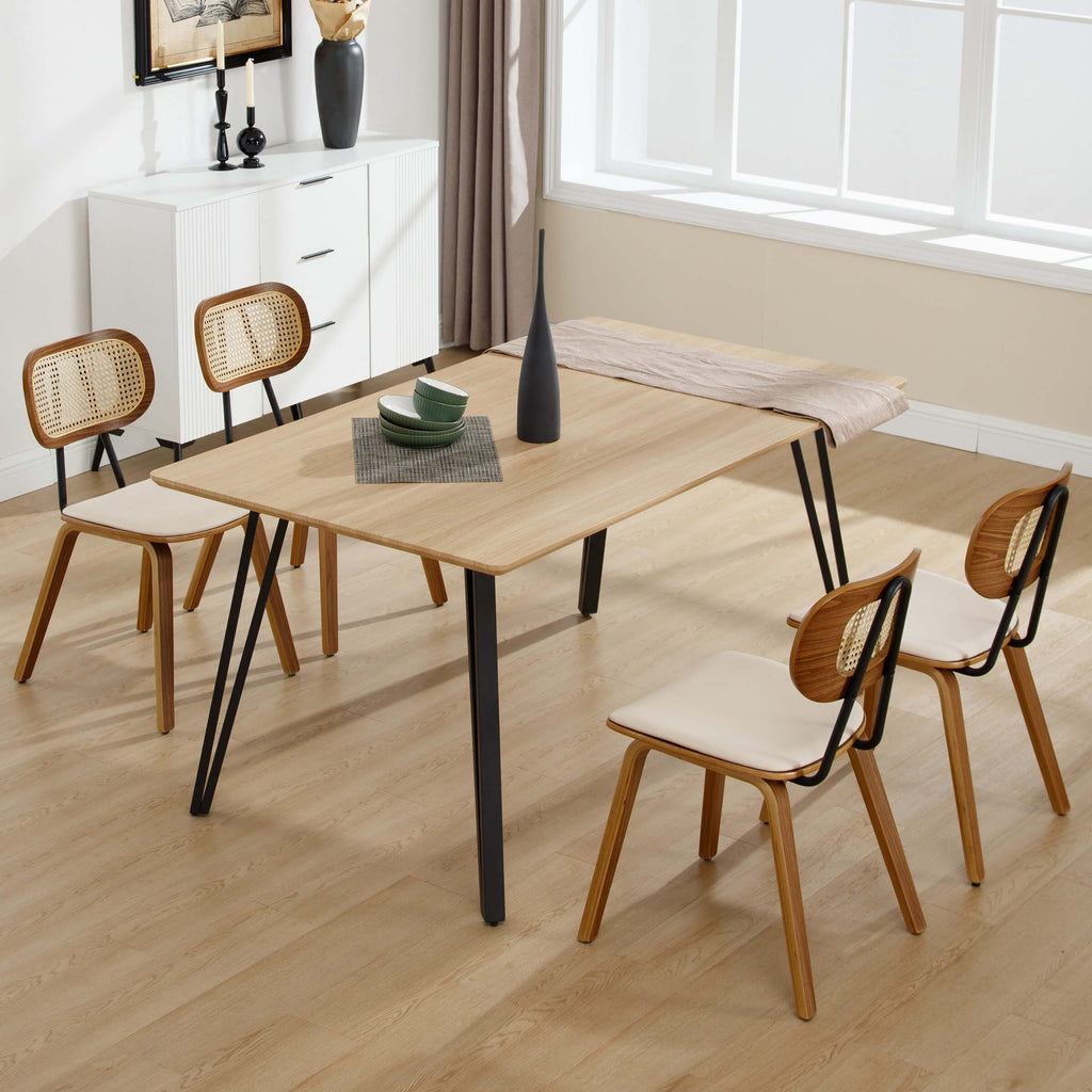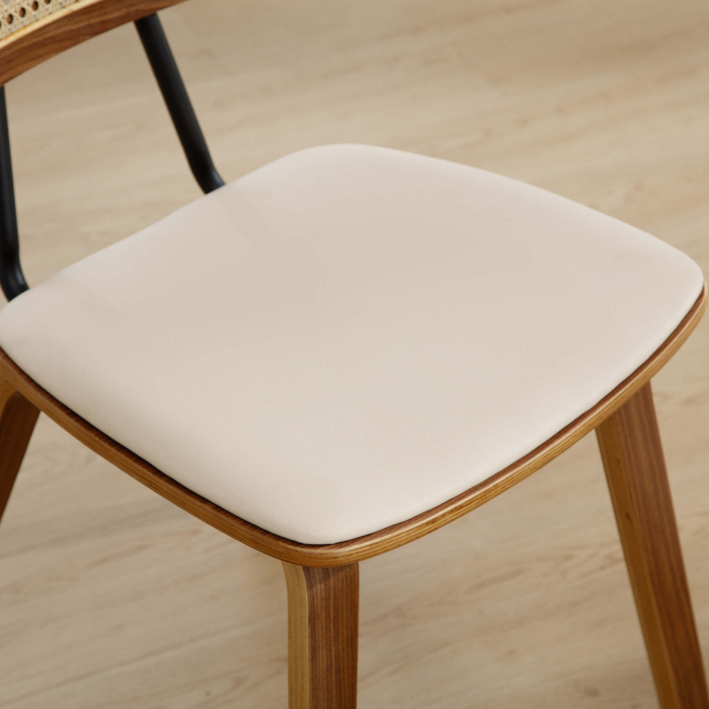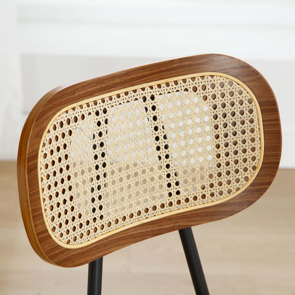 • It’s PU upholstered seat cushion and open rattan backrest design made from a wood frame.